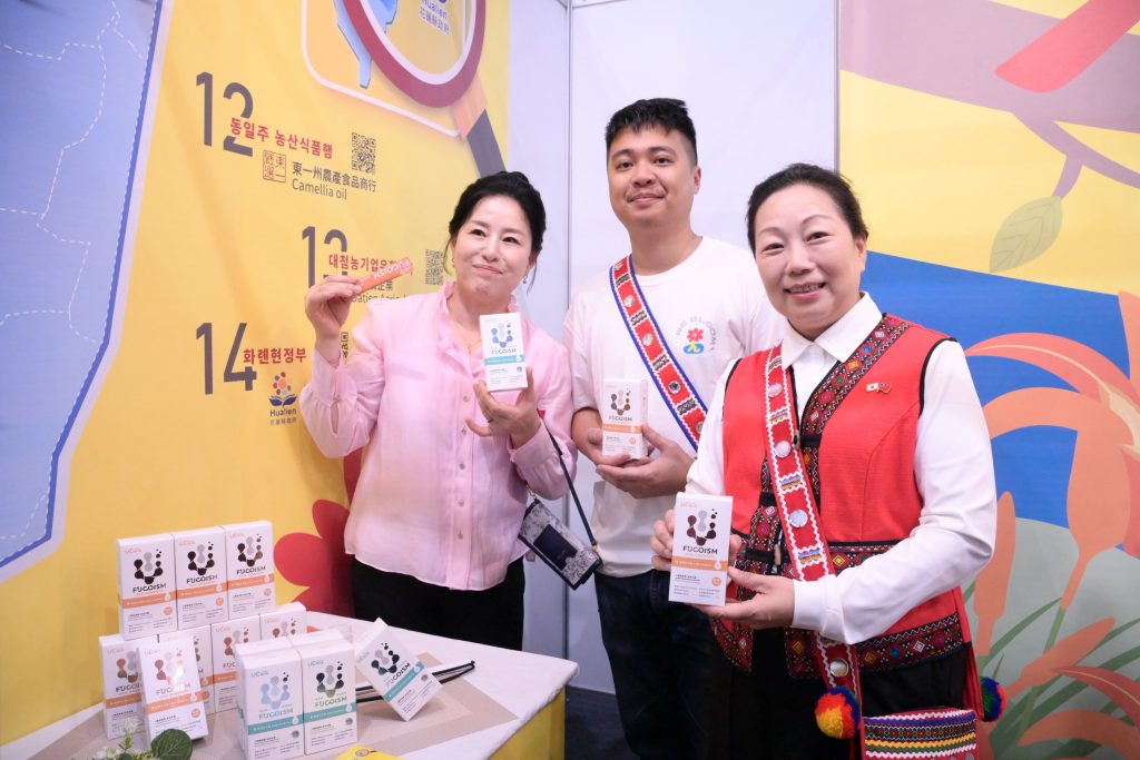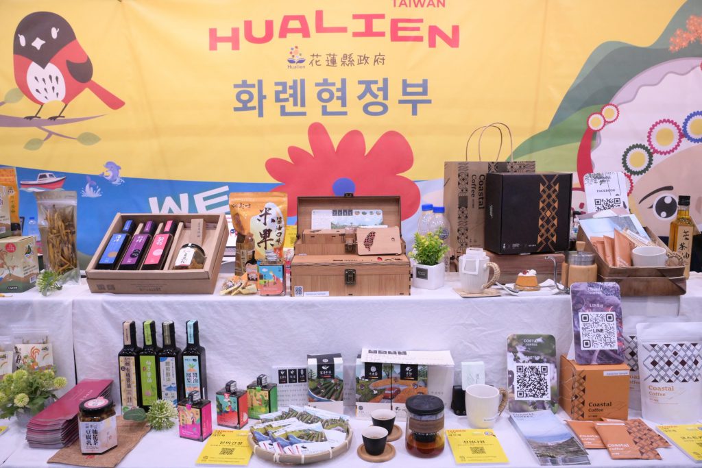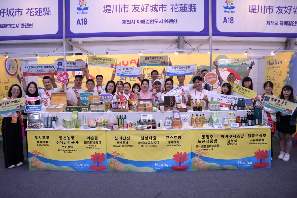 徐縣長親自向堤川市長夫人逐一介紹品牌,讓同樣盛產健康天然物產的堤川市也認識花蓮優質產品。本次參展13家花蓮企業包括「海岸咖啡」、「德森農莊」、「文旦復興」、「立川漁場」、「新味醬油」、「樸實構果」、「一品醇」、「原生好物」、「新糖城科研」、「淺草堂」、「天心茶園」、「東一嚴選」、「大添農」。特別的是,本次透過花蓮縣農會英/韓文線上商城,以跨境電商方式、線上線下虛實整合協助業者向國際行銷。(網址:https://hlfa.shoplineapp.com/?locale=en)