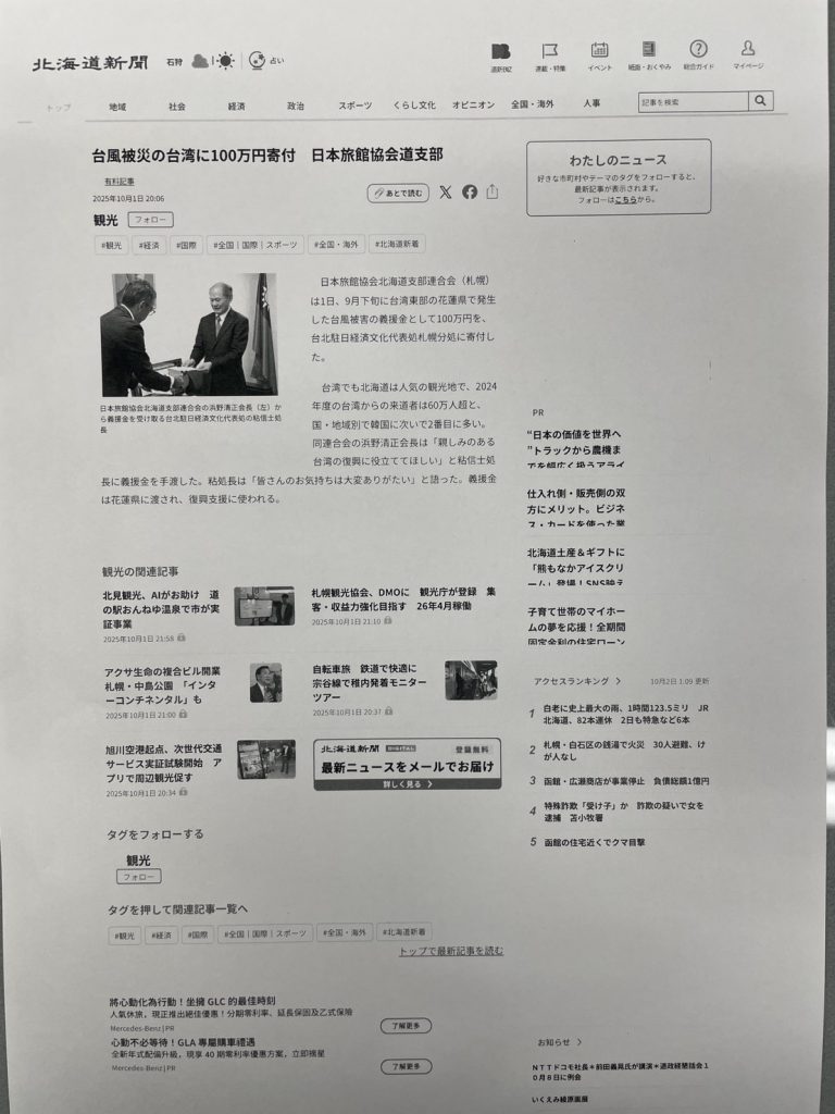 在眾多表達關心的行動中,最具體的捐助行動來自日本旅館協會北海道支部的會長濱野清正。10月1日上午,濱野會長及專務理事谷口哲也專程前往札幌分處,親手轉交了一筆100萬日圓的捐款支援花蓮的受災民眾。