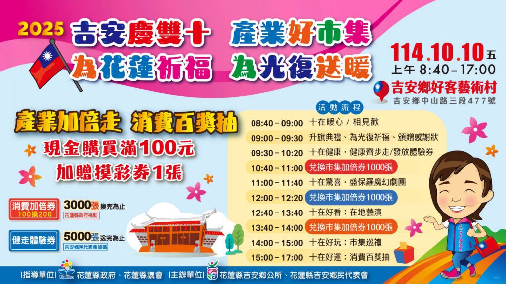 「產業加倍走,消費百獎抽!」為展現愛國情懷並活絡地方經濟,吉安鄉公所自109年起連續六年舉辦雙十節升旗典禮與創意慶典活動。今年更以「健走+市集+振興+祈福」四大主軸,推出『吉安慶雙十・產業好市集・為花蓮祈禱・為光復送暖』活動,將國慶慶典化為傳愛與行動的力量展現。