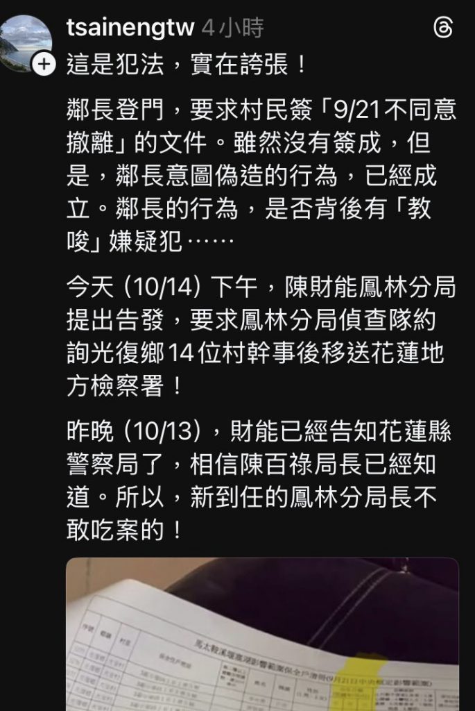 針對媒體報導「傷口灑鹽!花蓮光復災後3週才補撤離名冊 恐涉偽造文書」、「要求村民簽9/21不同意撤離書」情事,花蓮縣政府嚴正駁斥非事實,說明如下:經向光復鄉公所查證並取得調查表格,並取得公所同意代為澄清,該調查為依據中央協調所10/12疏散計畫會議結論啟動調查,參照9/21中央(台大版)為警戒範圍,由各鄉鎮公所進行調查,包含民眾實際居住情形、撤離能力和方式等。絕非重新網路或部分媒體所指稱「回溯9/21災害發生前偽造文書」,也無「要求村民簽9/21不同意撤離書」。