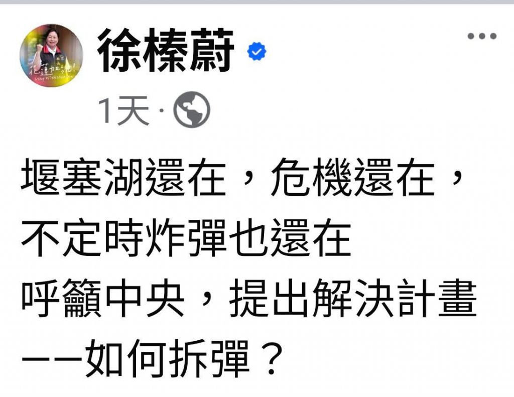 徐榛蔚指出,堰塞湖存在即意味著危機未除,「堰塞湖還在,危機就還在。中央應該提出具體計畫,如何安全『拆彈』,而不是讓居民繼續承受焦慮與不安。」