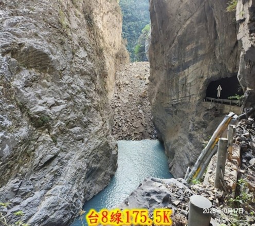 花蓮縣秀林鄉台8線(中橫公路)175.5靳珩隧道外側舊路廊(已移撥太魯閣國家公園管理處作為園區道路),於114年10月17日 12:00時,邊坡坍方土石淤塞立霧溪峽谷,該處河道寬度經林保署花蓮分屬估算約30公尺),經初步量測,堤頂高於現有台8線175.5k靳珩隧道西洞口路面,預估水位持續上漲,可能導致立霧溪水改道流入靳珩隧道(441公尺長)後,再由東洞口流出,漫過魯丹橋護欄排入魯丹溪,再匯入立霧溪,將造成台8線(中橫公路)167.7k~184.5k天祥至太魯閣道路中斷。公路局東分局已成立成立前進指揮所。另內政部太魯閣國家公園倌理處、林業保育署、台電溪畔發電廠等橫向單位均已知悉並派員前往現場。已發佈CMS、警廣vpn、幸福公路APP。經初步觀測,溪水上漲速率約1m/hr,目前距靳珩隧道西口路面高差約10公尺。