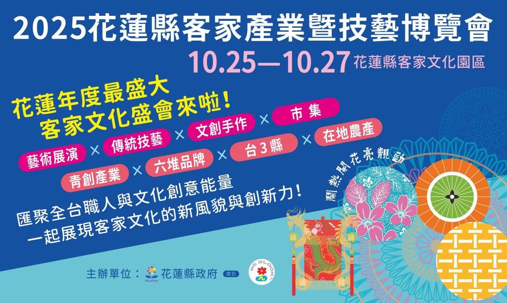 由花蓮縣政府主辦的「客家產業暨技藝博覽會」,將於10月25日(六)至10月27日(一)將於花蓮縣客家文化園區園區(花蓮縣吉安鄉中正路二段60號)鬧熱登場!今年博覽會以「跨區串聯.創新傳承」為主軸,匯聚來自臺三線、六堆及臺九線等客庄地區,精選特色產業與傳統技藝,展現台灣客家族群的創意能量與文化底蘊。
