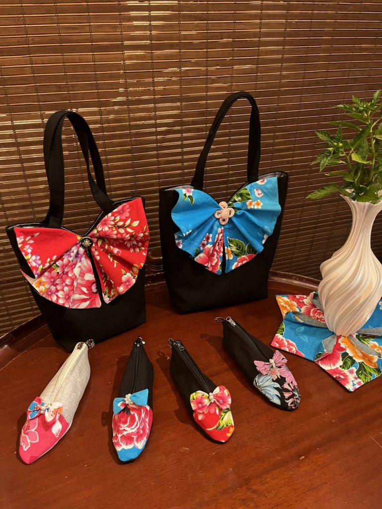 另外,手工鞋情繫的「客家花布」藝展,鍾逸潔老師的作品更令人眼晴一亮與驚艷,她由高雄美濃的客家小鎮出發,走過花蓮的成長歲月,到台南應用科技大學時尚設計系的磨練,一路浸潤在客家、原住民、閩南多元文化的薰陶之中,承襲母親服裝設計師的巧思與手藝,並將「客家花布」注入設計靈魂,融合環保素材與創新理念,讓每一雙手工鞋、每一件布藝作品,不僅實用,更承載著文化的感恩、傳承與創藝精神。
