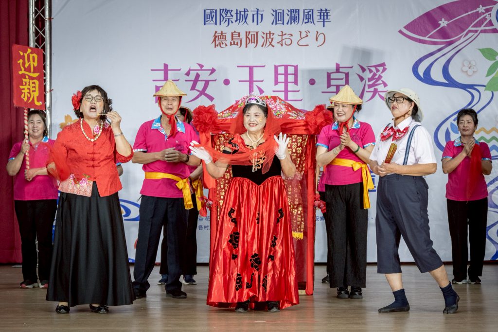 阿波舞團的表演充滿祭典氛圍,舞者隨著三味線與太鼓的節奏高喊:「Ah, yattosa!」、「Ah, yatto-yatto!」,象徵「好久不見,你們好嗎?」的問候,傳遞跨國友誼的溫暖。同時,舞者也走入觀眾席帶領全場共舞,許多鄉親也熱情回應「yattosa!yattosa!」,隨著音樂手舞足蹈,現場洋溢彼此鼓舞的熱情能量,畫面溫馨動人。