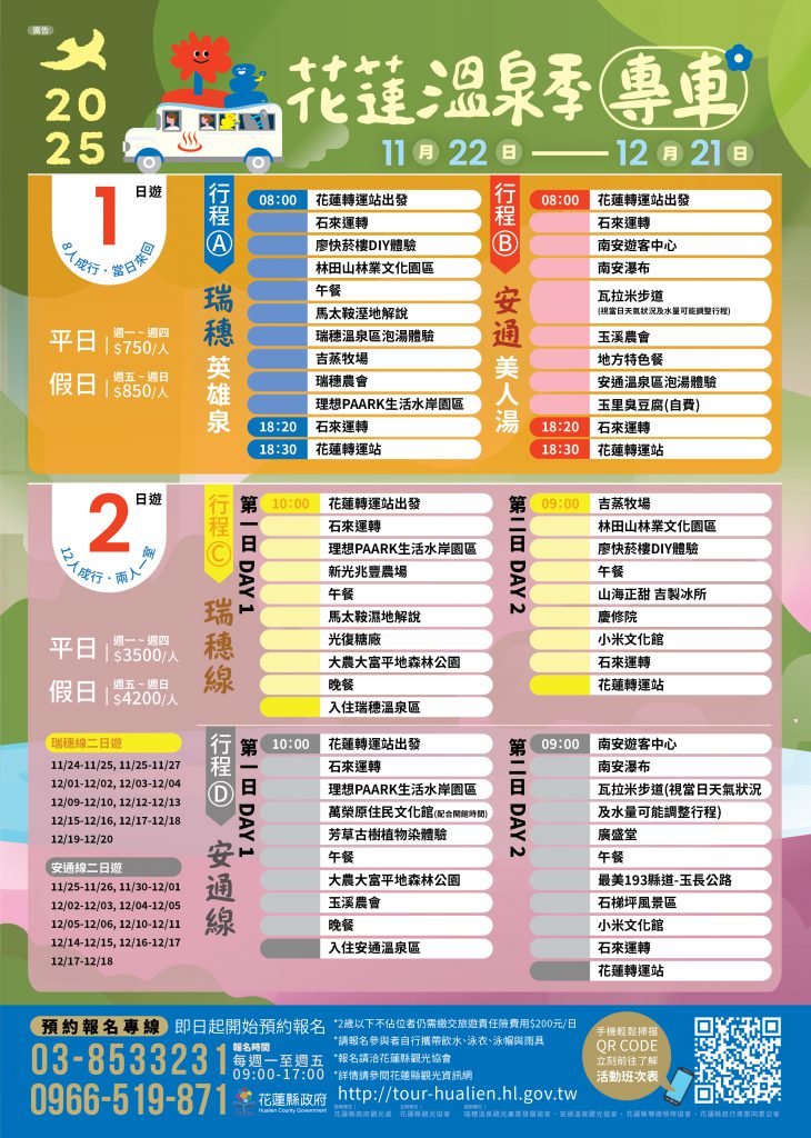 溫泉專車行程亦於114 年11月22日至12月21日同步啟動,提供一日遊與二日遊兩種選擇。一日遊包含瑞穗與安通兩條路線,每日自花蓮轉運站出發,八人成行,平日750元、假日850元,費用包含午餐、泡湯、隨車導覽、伴手禮與保險,行程豐富、輕鬆超值。二日遊則結合花蓮中南區文化景點與溫泉體驗,十二人成行、兩人一室,平日每人3,500元、假日4,200元,是深入探索花蓮南區自然風貌與文化底蘊的最佳選擇。