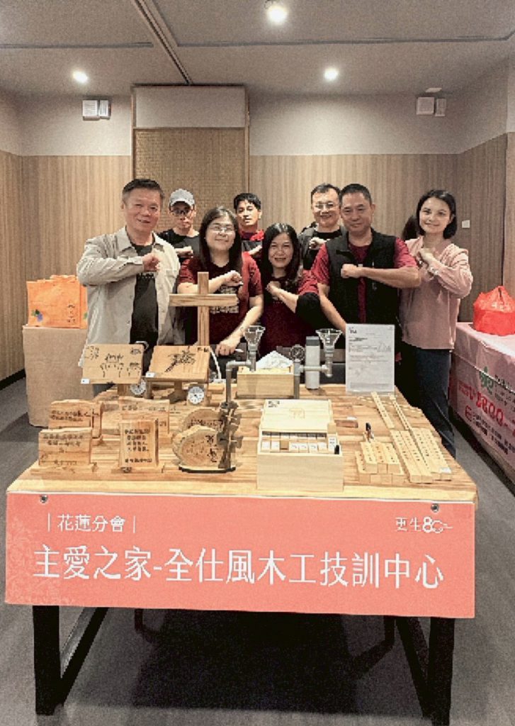 會場同時展出主愛之家木工職訓成果,由弟兄親手打造的作品充滿生命重新站起的力量,深受嘉賓肯定。公證人何叔孋採購1萬元、金東里驗車廠採購6,600元、順發鐵櫃溫瑞玉顧問認購2,500元精油禮盒。這些採購支持的不僅是產品,更是協助更生人穩定復歸的力量。