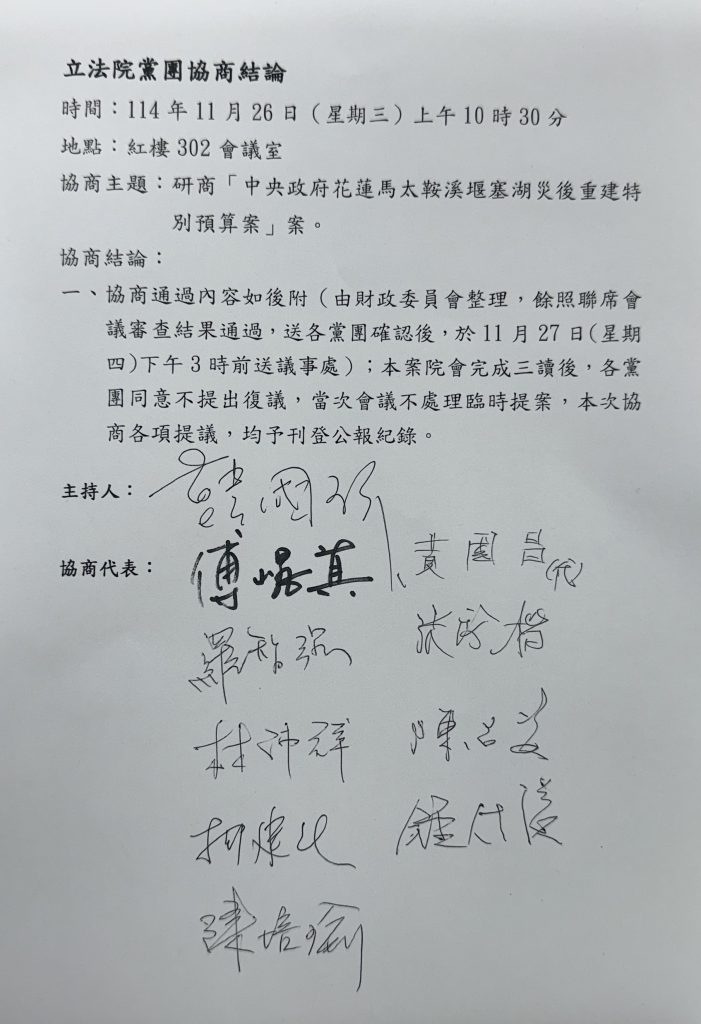《馬太鞍溪堰塞湖災後重建特別條例》已於11月11日經總統公布施行,政府編列300億元預算,原本實際用於花蓮災民僅佔6%,在花蓮縣政府的全面檢核及崐萁的極力爭取下,今天由韓國瑜院長邀集三黨及各部會協商,要求增列的所有補助經費,全數無異議通過。