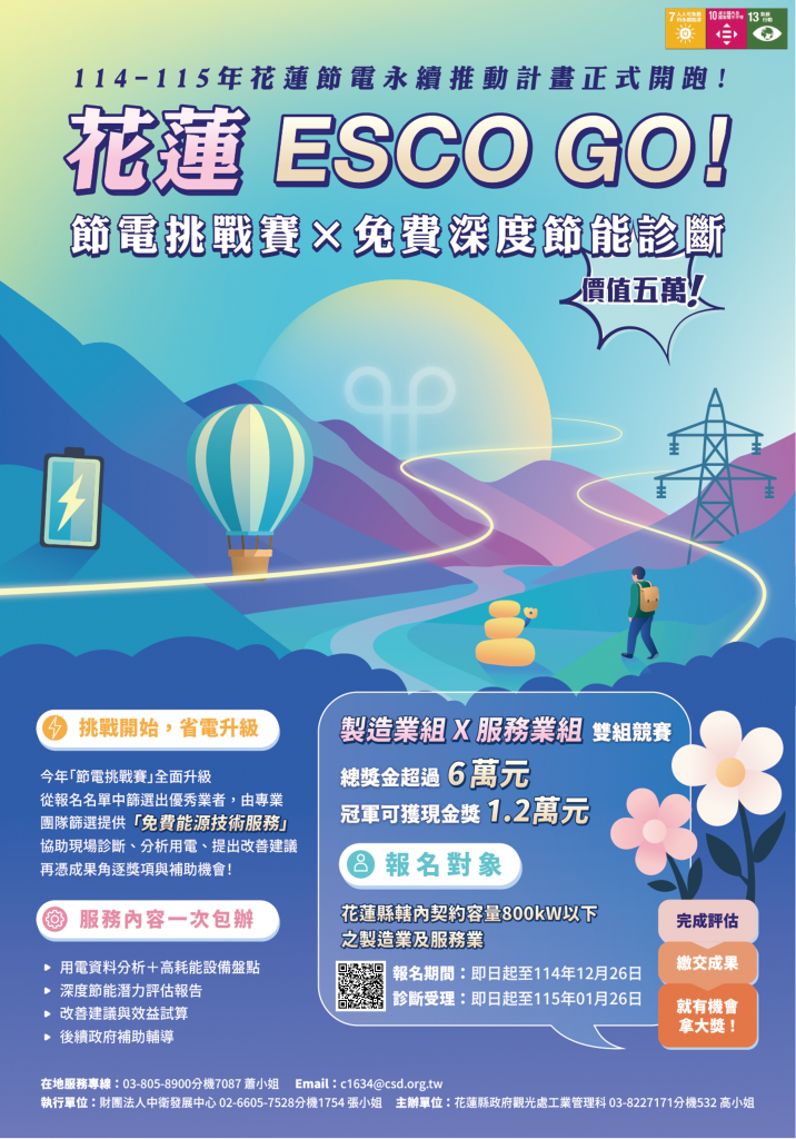 花蓮縣政府推出「花蓮ESCO GO!節電挑戰賽暨免費深度節能診斷」,即日起開放報名至114年12月26日止,針對本縣用電契約容量800kW以下的製造業、服務業為主要對象,凡符合資格者,報名即享有市價五萬元的免費深度節能診斷服務,安排專業診斷團隊到場現勘,並提供用電改善措施、媒合補助資源、協助撰寫評估計畫書等服務,期盼全力協助產業升級與轉型,加速邁向2050淨零排放目標。