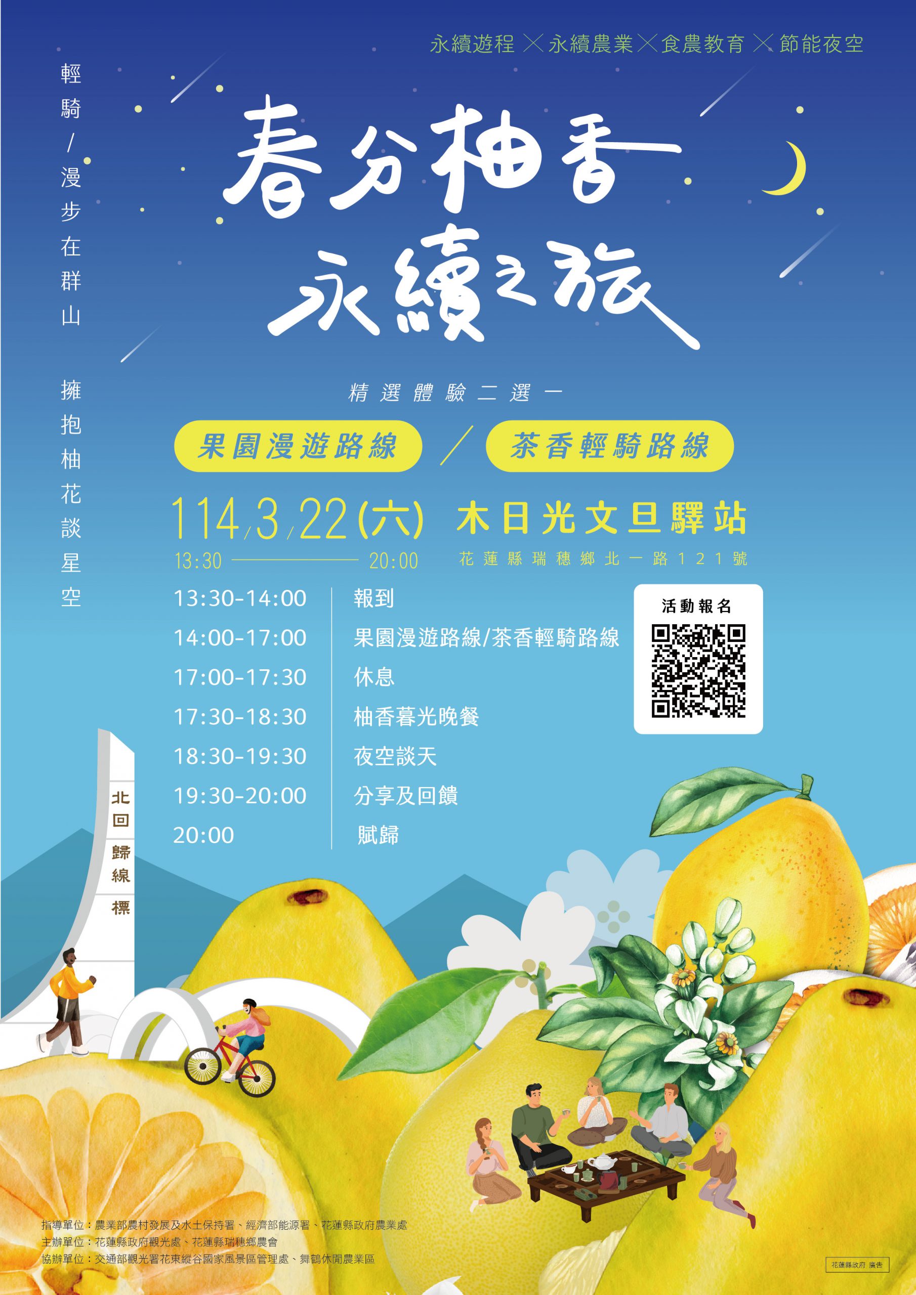 由花蓮縣政府與瑞穗鄉農會主辦之「春分柚香 永續之旅」體驗活動,將於3月22日在木日光文旦驛站舉辦,本次與交通部觀光署花東縱谷國家風景區管理處、舞鶴休閒農業區合作,以「永續遊程」、「永續農業」、「食農教育」和「節能夜空」為主題規劃,提升民眾對綠色消費、低碳生活及永續發展的能源意識,希望透過資源的有效利用與實踐,攜手打造宜居永續的未來城市。