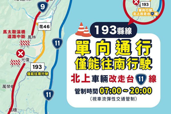 【光復鄉災後重建進展暨交通管制公告:193線救災優先 一般用路人請改道台11線】